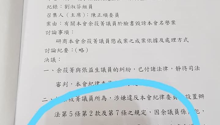 新竹縣議會昨天(17日)開第9次臨時會,在紀律委員會討論綠黨籍議員余筱菁日前在臉書上針對焚化爐興建案發文言論有否誹謗議會名譽,經表決以19比5票通過,余筱菁在下一次臨時會(8月10日至8月14日)中,被處以「定期停止出席議會」的懲戒。