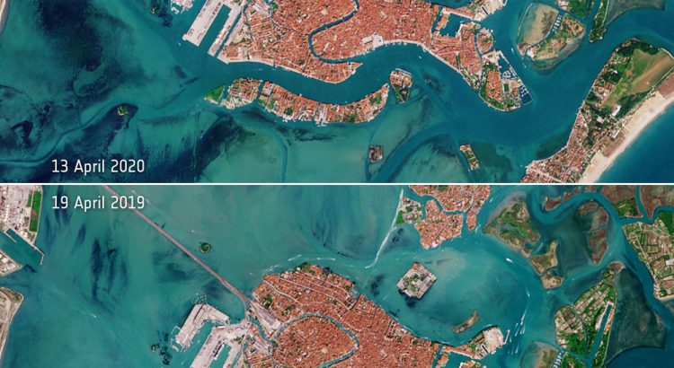 根據《CNN》報導,歐洲太空總署(European Space Agency)近日公布由Sentinel-2衛星拍攝的威尼斯空拍照,只見當地去年4月19日時水質十分混濁,鄰近水域幾乎都是黃澄澄一片泥沙,並有大量船隻在運行;作為對比,今年4月13日該水域已清澈見底。