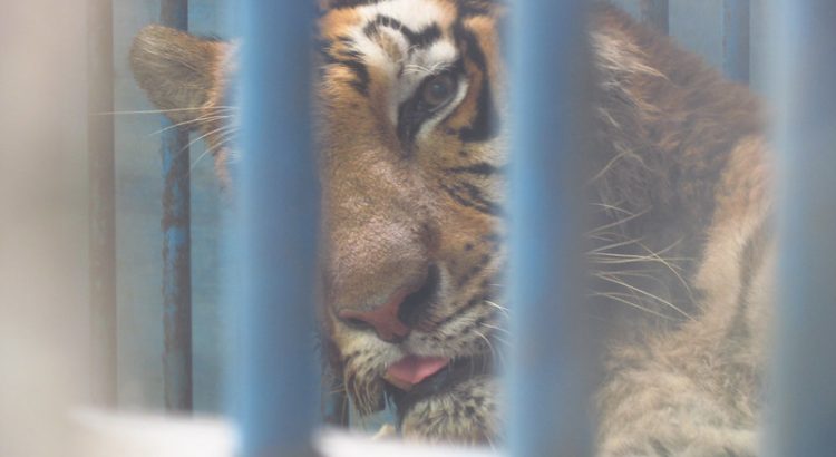 台南世界蛇王教育農場內飼養的老虎,長期被囚禁在單調、無任何豐富化設施的狹小籠內,老虎出現無精打采、靜止不動,同樣為野生動物遭不當飼養後,因沮喪、挫折產生的異常行為。